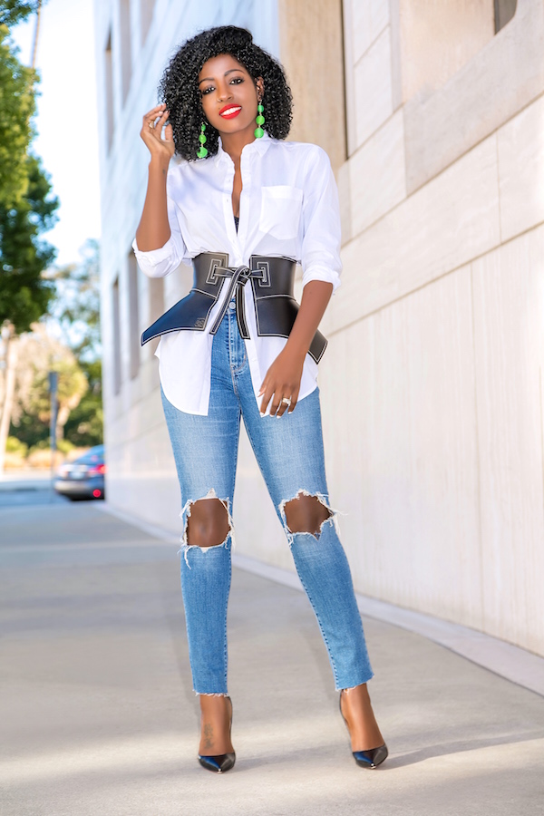 Boyfriend Shirt + Peplum Belt + Ripped Levi’s March 2, 2018 Outfit Details: Shirt: Gap | Belt: Loewe | Jeans: Levi’s | Shoes: So Kate. Enjoy and have a blessed weekend. xo Tags black leather so kate pumps boyfriend shirt levis jeans loewe belt riped levis jeans so kate pumps white boyfriend shirt